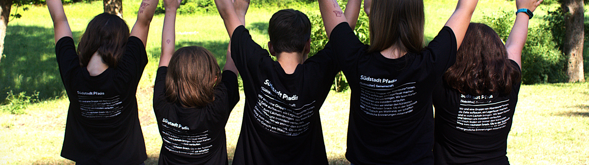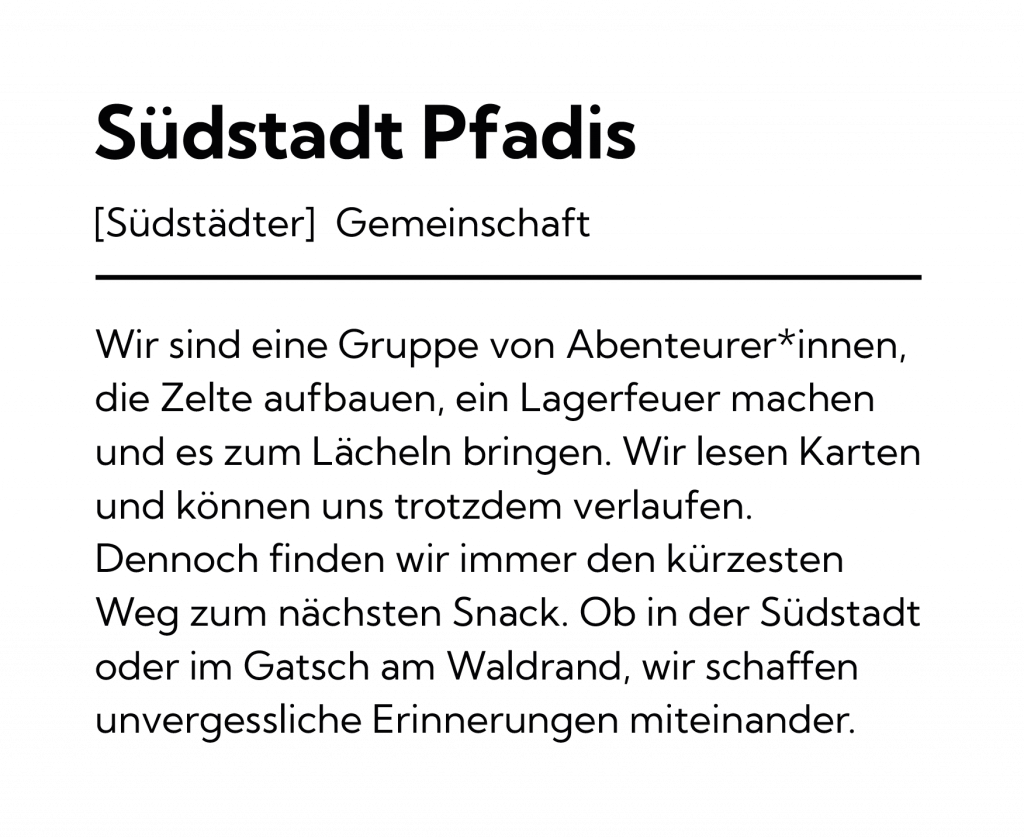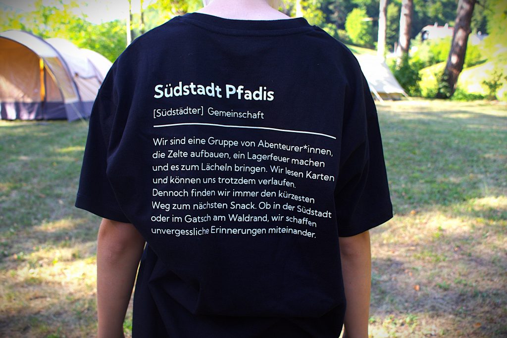 Auf der Rückseite eine humorvolle Defintion der Südstadt Pfadis, die zeigt, was uns ausmacht: gemeinsam lachen, Abenteuer erleben und Erinnerungen schaffen, die bleiben. Der Merch steht für all die guten Zeiten, die wir als Gruppe teilen – von der Heimstunde bis zum Sommerlager.
